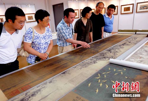 7月8日,觀眾在福州舉辦的“兩岸故宮高仿真宮廷畫聯(lián)展”上被展出的一幅合璧版仿真《富春山居圖》所深深吸引!陡淮荷骄訄D》是元朝畫家黃公望的代表作,是其為無用師和尚所繪,以浙江富春江為背景,全圖用墨淡雅,山和水的布置疏密得當(dāng),墨色濃淡干濕并用,極富變化,被譽(yù)為中國十大傳世名畫之一,其流傳經(jīng)歷充滿傳奇色彩,目前兩岸各存一段。據(jù)了解,此次“兩岸故宮高仿真宮廷畫聯(lián)展”共展出130余件高仿真作品,囊括了隋唐五代、宋、元、明、清和近代各個時期書畫名家的傳世佳作。