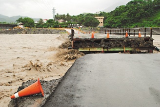 昨天上午10時許,六龜鄉(xiāng)六龜大橋旁的便橋因支撐不住暴漲荖濃溪水沖刷,中間一截應(yīng)聲斷裂,工務(wù)段緊急管制封閉;新開部落聯(lián)外的新寶橋旁便橋也同樣遭荖濃溪水沖毀,百余戶新開部落居民無法外出,臺軍士兵昨天一度冒雨搶通便道。