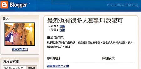昨天更有出現(xiàn)冒稱應(yīng)召女“妮可”的部落格《薇琪寶貝的小天地》,發(fā)文時(shí)間緊扣《壹周刊》報(bào)道陳致中召妓疑云的時(shí)間點(diǎn),如7月3日指“接了個(gè)名人客人”、22日“被《壹周刊》拍”等。