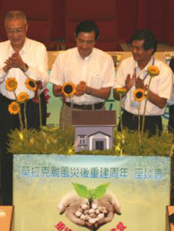 馬英九以及吳敦義都參加了“莫拉克災(zāi)后重建周年座談會(huì)”。馬英九說(shuō),“八八風(fēng)災(zāi)”所帶來(lái)的巨大雨量與造成對(duì)土地的侵害更勝已往。經(jīng)過(guò)這次的學(xué)習(xí),對(duì)于往后的災(zāi)變可以預(yù)先建立相關(guān)制度,像是鄰鄉(xiāng)村系統(tǒng)、警政系統(tǒng)、消防系統(tǒng)、再來(lái)是“水利署”、“經(jīng)濟(jì)部”與“農(nóng)委會(huì)”等七個(gè)或八個(gè)系統(tǒng),再加上防災(zāi)辦公室,對(duì)于緊接的8、9月份臺(tái)風(fēng)季節(jié),采取“料敵從寬、御敵從嚴(yán)”的態(tài)度,相信可以防止災(zāi)害再度發(fā)生。