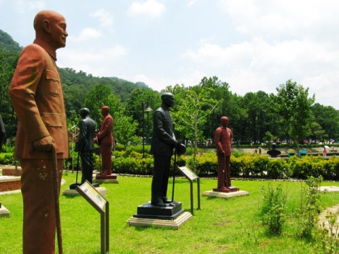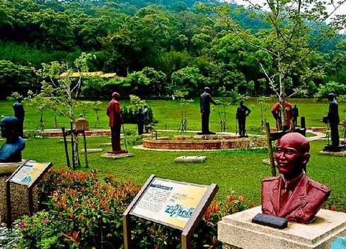 教授告訴我,這個雕像群落多達(dá)兩百余座蔣介石雕像,因上世紀(jì)90年代后期“去蔣化”運(yùn)動,各地矗立的銅像紛紛拆除,面臨回爐煉銅的命運(yùn)。慈湖所在的桃園縣當(dāng)時正值“藍(lán)營”執(zhí)政,于是將各地拆除的銅像收來,選出其中藝術(shù)水準(zhǔn)較高者,建成雕塑群。