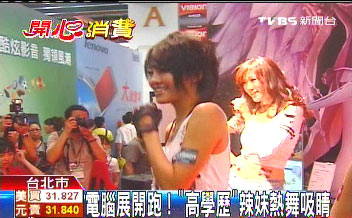 據(jù)臺灣TVBS電視臺報(bào)道,臺北計(jì)算機(jī)展大會舞臺還沒開鑼,參展廠商就派巧克力膚色辣妹開始搏版面,沒有舞臺就在展場地毯展現(xiàn)動感。有的廠商由于和隔壁搞競爭搶眼球,上午11點(diǎn)半的Show Gilr表演,足足提早1小時(shí)。