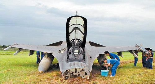 當(dāng)年6月26日機號6812的F-16B型雙座機,由嘉義聯(lián)隊莊姓分隊長駕駛,后座載著“國防部”整評室副主任陳姓少將,進(jìn)行戰(zhàn)術(shù)攔截課目的熟飛,降落時,未注意跑道積水,致使戰(zhàn)機落地時,飛行員施放阻力傘后戰(zhàn)機嚴(yán)重右偏,雖然隨即拋棄阻力傘,立即使用方向舵及煞車改正偏右狀況仍無效,戰(zhàn)機降落跑道上行進(jìn)約一公里后沖向草坪,機身嚴(yán)重受損;經(jīng)評估修復(fù)戰(zhàn)機,不包括發(fā)動機的修復(fù)即要花800多萬元新臺幣。