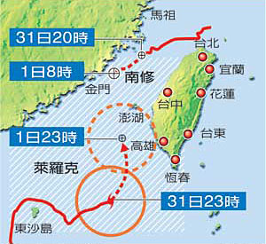 中新網(wǎng)9月1日電 據(jù)臺(tái)灣《聯(lián)合報(bào)》報(bào)道,昨晚八點(diǎn)半,臺(tái)灣“氣象局”發(fā)布臺(tái)風(fēng)“萊羅克”海上警報(bào),今天凌晨兩點(diǎn)半再度發(fā)布陸上警報(bào)。移動(dòng)速度緩慢的“萊羅克”正在打轉(zhuǎn),今明兩天是最靠近臺(tái)灣的時(shí)候,今晚暴風(fēng)邊緣可能在臺(tái)灣西南沿海附近。另外,臺(tái)風(fēng)“南修”也會(huì)影響臺(tái)灣部分地區(qū)。