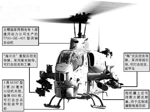 AH-1W武裝直升機(jī)機(jī)長約18米,高4米,最大起飛重量近6700公斤,采用串列座艙設(shè)計,由2名機(jī)組成員操控,裝備有機(jī)關(guān)炮、火箭彈、空空導(dǎo)彈和反坦克導(dǎo)彈,是目前臺軍直升機(jī)部隊中攻擊力最強(qiáng)的機(jī)型。(何西)