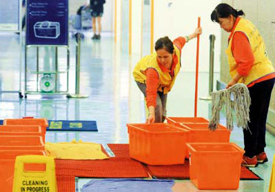 為了避免影響觀瞻,桃園航空站原本規(guī)定室內(nèi)漏水不得用水桶承接,只能用地毯或毛巾放在地上吸水,飽和后再擰到水桶搬走。可是昨天的漏水量太大,地毯及毛巾已經(jīng)無(wú)法應(yīng)付,清潔人員還是被迫搬來(lái)十多個(gè)水桶接水。