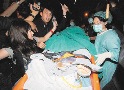 Selina24日一下專機(jī),即被救護(hù)車火速送往林口長(zhǎng)庚醫(yī)院,當(dāng)時(shí)她從頭到腳都包著綠色床單,躺在擔(dān)架床上,她的四周還有十多名經(jīng)紀(jì)公司人員,撐傘擋住記者鏡頭,完全看不到她的表情,她也沒有發(fā)言,記者則不斷推擠,現(xiàn)場(chǎng)十分混亂。
