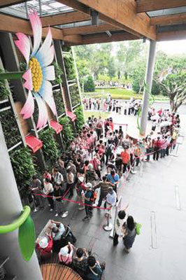 另外,針對(duì)夢想館、養(yǎng)生館、真相館、名人館、故事館等5個(gè)展館,花博總部采發(fā)放預(yù)約券入館,從早上9點(diǎn)開始一次發(fā)放,發(fā)完為止;其中最熱門的夢想館,每日發(fā)放四千張預(yù)約券,25日上午到11時(shí)左右則發(fā)了兩千多張,并未如預(yù)期“暢銷”;而之前同樣熱門的“夢想劇場”,因不發(fā)放預(yù)約券,采用現(xiàn)場排隊(duì),場外則是大排長龍。