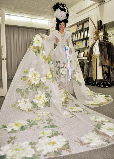 2010全球生態(tài)旅游小姐決賽24日在南京舉行,數(shù)十名佳麗參賽,臺灣實(shí)踐大學(xué)服裝設(shè)計系學(xué)生林育如,身著一襲以臺北花博萬華區(qū)區(qū)花白牡丹為意象設(shè)計的服裝參賽,驚艷全場,拿下最佳生態(tài)旅游小姐獎,林育如26日載譽(yù)返臺,在高雄家鄉(xiāng)展示參賽服裝。