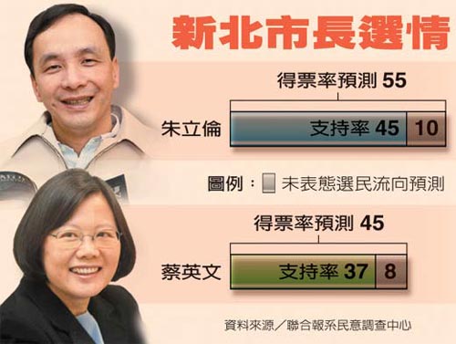 年底新北市長(zhǎng)選戰(zhàn),將由民進(jìn)黨蔡英文迎戰(zhàn)國(guó)民黨朱立倫。調(diào)查發(fā)現(xiàn),朱立倫目前獲得四成五選民支持,三成七力挺蔡英文。