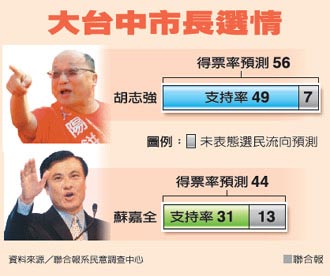 分析顯示,胡志強(qiáng)在臺中市獲得五成五支持,二成九挺蘇嘉全;臺中縣選民觀望比率較高,四成五力挺胡,三成二屬意蘇。