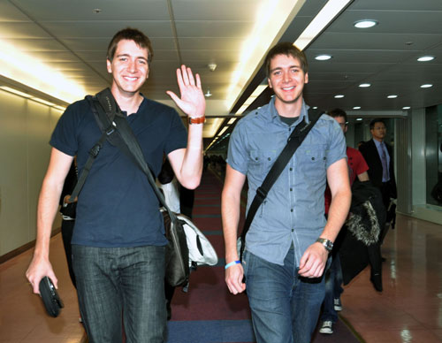 《哈利波特》系列電影《哈利波特:死神的圣物》先前在倫敦首映掀熱潮,電影19日將在臺灣上映。片中榮恩的雙胞胎哥哥“弗雷”與“喬治”本人詹姆斯與奧立佛菲爾普斯(James & Oliver Phelps),在發(fā)行片商華納兄弟牽線下,15日上午搭機(jī)抵臺,為新片宣傳。