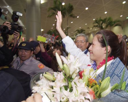 楊淑君22日晚18時50分搭機(jī)隨隊返臺。從步出登機(jī)門,到入境大廳的過程中,不少旅客高喊楊淑君加油,也有免稅店的店員、入出境旅客頻頻向她比出V字型勝利的手勢。
