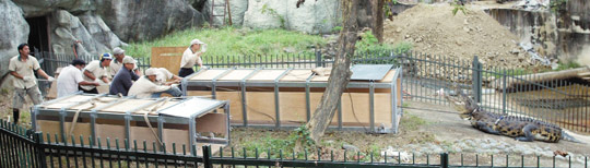 由于無人敢接近河口鱷,保育員采繩索硬拖拉法,八名保育大漢像拔河一般,將河口鱷硬拉進(jìn)長鐵籠內(nèi)。隨后又以同樣模式,再硬拖重約一百三十公斤母鱷進(jìn)入另一鐵籠,以吊車先后安移入新居,與凱門鱷隔欄而居。