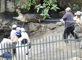 昨天上午九時,動物園保育員如臨大敵,先將特制兩座大長鐵籠,以吊車安置到鱷魚池區(qū)內(nèi);兇猛的咬人公河口鱷靜臥水池,母鱷臥停在池邊角落爛泥區(qū),保育員先丟擲一只肉雞誘食,觀察已七天未喂食的公鱷反應(yīng),公鱷絲毫未理會。