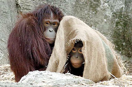 臺(tái)北市動(dòng)物園里的猩猩也冷到受不了,蓋著麻布抵擋寒風(fēng),沒(méi)搶到的只好依偎在同伴身旁取暖。(圖:臺(tái)灣《中國(guó)時(shí)報(bào)》)