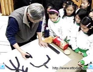 據(jù)臺灣媒體報道,從書包里一一拿出墨汁、宣紙等寫書法的工具,要寫出一帖好字,劉校長說,還得靠這項秘密武器才行,就是藍色抹布卷成尖桶狀,沾上些許墨汁,緊接著抹布揮毫秀開始。