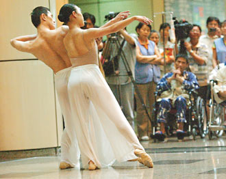 云門舞集成立已經(jīng)三十五周年,在全臺十九家醫(yī)院推出“醫(yī)院里的春天”巡演,把舞臺搬到醫(yī)院。臺大醫(yī)院昨天過113周年生日,云門舞者帶來“水月”的精華片段,沒有另外搭舞臺,沒有燈光,在樸實的醫(yī)院大廳上演最真實的感動,駐足的觀眾把舞者團團圍住,還有病人坐著輪椅觀賞。