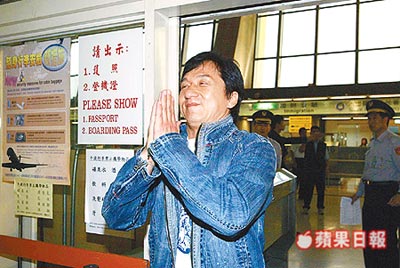 成龍19日傍晚離臺(tái),雙手合十感謝臺(tái)灣朋友。(圖:臺(tái)灣《蘋果日?qǐng)?bào)》)
