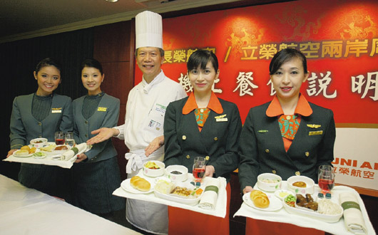 兩岸周末包機(jī)公司不只搶頭班機(jī)、比載客率,在餐點(diǎn)上也相互較勁。華航昨(1)日宣布商務(wù)艙將推出臺北故宮“晶華國寶宴”,圖中長榮、立榮則推出涵蓋兩岸各地的風(fēng)味菜色。(臺灣《聯(lián)合報(bào)圖》)