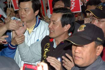國(guó)民黨候選人馬英九(左二)21日在臺(tái)北縣掃街前表示,因?yàn)檫x民手中的一票,決定臺(tái)灣的未來(lái)。一向挺綠的坪林鄉(xiāng)長(zhǎng)王潮清(右二)也在馬英九見(jiàn)證下加入國(guó)民黨,讓藍(lán)營(yíng)士氣大振。