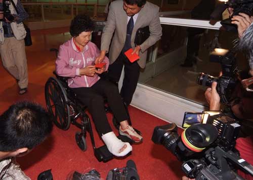 臺(tái)中乾隆旅行社團(tuán)員在四川發(fā)生強(qiáng)震時(shí),遭落石擊中腳踝,十五日凌晨坐輪椅返臺(tái),所幸沒有生命危險(xiǎn),旅行社也送上紅包。(“中央社”圖)