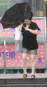 “鳳凰”臺風(fēng)來襲,臺北市街頭不時出現(xiàn)強風(fēng)讓路過行人手中的雨傘直接開花。