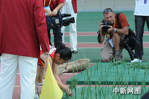 中新網(wǎng)泉州10月28日電 (劉通)今天上午,第六屆全國農(nóng)民運(yùn)動會田徑項目在福建泉州海峽體育中心開賽。圖為專注采訪農(nóng)運(yùn)60米插秧比賽的兩名外國記者。