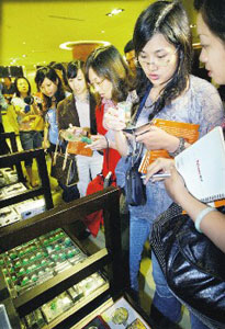 據(jù)悉,踩線團(tuán)成員中大約有四分之一到過臺灣。在參觀完臺北“故宮博物院”后,團(tuán)員們心情愉快,雖被媒體緊盯,仍不影響消費(fèi)力,采買許多“故宮”小飾品。其中,每個(gè)100元(新臺幣,下同)仿翠玉白菜吊飾和每個(gè)300元的頌壺耳環(huán),很多人一口氣就買五、六個(gè)翠玉白菜。