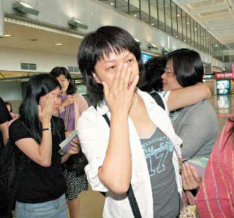 大陸踩線團(tuán)上午搭澳門航空離臺,團(tuán)員難舍臺灣工作人員,相互擁抱淚流。每個團(tuán)員都滿載而歸,有臺灣特產(chǎn)、水果、旅游資料。 《聯(lián)合晚報》圖