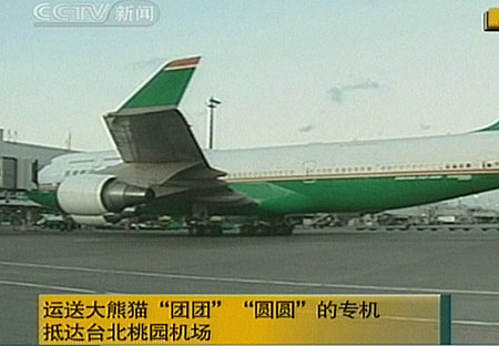 12月23日下午5時許,運送大熊貓“團團”“圓圓”的專機抵達(dá)臺北桃園機場。(電視截圖)