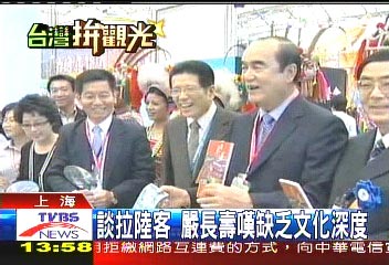 臺灣觀光協(xié)會要嚴長壽帶領金門連江宜蘭花蓮到上海,營銷臺灣旅游,面對先前北京喊出百萬人游臺,嚴長壽感嘆,光喊拉大陸客的口號不夠,臺灣拼觀光還是缺乏文化深度。