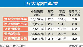 中新網(wǎng)11月5日電 根據(jù)1111人力銀行調(diào)查,扣除兼差等部分工時(shí)工作,臺(tái)灣有五大“窮忙”產(chǎn)業(yè),分別為餐飲旅游娛樂(lè)業(yè)、百貨零售門(mén)市業(yè)、文教出版業(yè)、傳統(tǒng)制造業(yè)還有媒體廣告業(yè)。