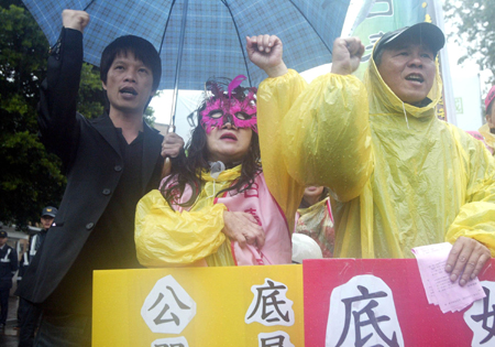 中新網(wǎng)11月27日電 臺灣性工作團(tuán)體“日日春關(guān)懷互助協(xié)會”今天上午前往臺灣當(dāng)局“行政院”門口陳情,要求兌現(xiàn)陳水扁“大選”時的承諾。知名導(dǎo)演侯孝賢與林靖杰也到場聲援。