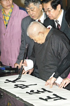 六歲習(xí)字,曾在“總統(tǒng)府”為蔣介石寫(xiě)帖子、格言,50多歲開(kāi)始教授書(shū)法的楊家麟,昨天在學(xué)生簇?fù)硐,用手抹平宣紙,?rùn)潤(rùn)筆,凝氣重新寫(xiě)下“大中至正”,就跟掛在牌樓上近30年的字體一模一樣。