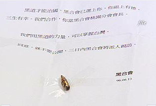據(jù)臺(tái)灣東森新聞報(bào)道,今年6月從桃園寄到“立法院”指名要給“立委”林淑芬等13名“立委”的恐嚇信,里面還有附2顆子彈,這個(gè)自稱“黑合會(huì)”的恐嚇者就是前云林縣調(diào)處調(diào)查員楊清海,早在7年前他就曾經(jīng)因?yàn)榭馗媲啊罢{(diào)查局長(zhǎng)”王光宇而聲名大噪。