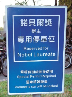 這個(gè)專屬停車位,位在臺大小椰林大學(xué)旁的“中研院”原分所后方。停車位旁還樹立了一個(gè)醒目的標(biāo)示牌,藍(lán)底白字用中英文寫著“諾貝爾獎(jiǎng)得主專用停車位”,上頭還注明“需經(jīng)特別核準(zhǔn)后使用,違車將被鎖車”。