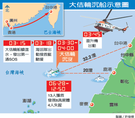 臺灣搜救中心指出,昨天凌晨三時十五分,接獲臺中海巡單位轉(zhuǎn)報大佶輪發(fā)出求救訊號,即指揮臺中海巡隊出動巡防艇于三分鐘后馳往;凌晨四時,大佶輪完全沉沒,在雷達幕上消失。