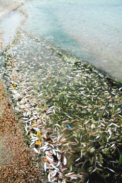 澎湖馬公市青灣海岸漂來大批魚尸,珊瑚礁魚類受創(chuàng)尤其嚴(yán)重。 聯(lián)合報(bào)圖