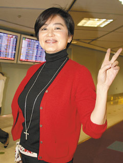 林青霞身上穿著和前一天晚上現(xiàn)身機場很類似,依舊紅外套配黑衣黑褲,她說是討吉利,象征她所支持的人一定能當選。