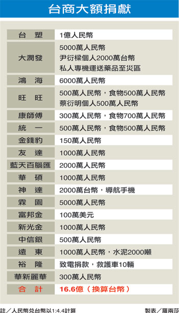 至昨天為止,臺(tái)灣企業(yè)及企業(yè)主承諾捐款金額已突破二十億新臺(tái)幣,創(chuàng)臺(tái)商對(duì)大陸單一天災(zāi)捐款紀(jì)錄。