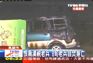 據(jù)臺(tái)灣TVBS報(bào)道,事發(fā)現(xiàn)場,小客車被燒得只剩支架。疑似用汽油引火自焚的男子,是已經(jīng)高齡80歲的老兵許昭榮。