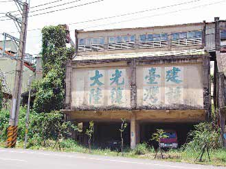 在苗栗縣三灣往南莊風(fēng)景區(qū)路上,有棟廢棄建物墻上仍保留“建設(shè)臺灣,光復(fù)大陸”的斗大標(biāo)語,字跡斑駁,卻引人注目。有人認為這些標(biāo)語早已過時,大陸客來臺有極大商機,不必造成大陸客不快,建議涂銷;但也有人認為這是當(dāng)年軍隊轉(zhuǎn)進來臺時的標(biāo)語,是兩岸敵對狀況的歷史見證,頗具懷舊風(fēng)味,應(yīng)該保留。