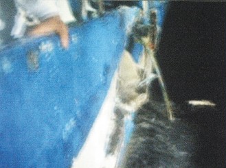 李慶華昨天還公布了由“聯(lián)合號(hào)”上一名釣客在事發(fā)前后所拍攝的一卷錄像帶,畫(huà)面中看出日艦“PL123”是在“聯(lián)合號(hào)”右側(cè)后方平行航行,隨后卻從右側(cè)擦撞,海釣船船身中央立即出現(xiàn)一個(gè)大洞。何鴻義到機(jī)房查看,發(fā)現(xiàn)進(jìn)水狀況嚴(yán)重,下令全體釣客與船員放下救生筏棄船逃生,當(dāng)時(shí)日艦就在距離聯(lián)合號(hào)約數(shù)十米處以探照燈監(jiān)視。