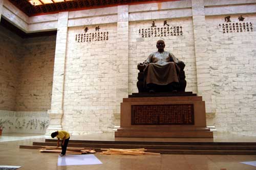 一大早中正紀(jì)念堂的大門一打開,觀光客們迫不及待進(jìn)入大廳和蔣介石銅像合影留念。不少人都認(rèn)為,把特展上花花綠綠的風(fēng)箏、五顏六色的圖片廣告牌移除,恢復(fù)到像以往的模樣,看起來(lái)莊嚴(yán)多了,也比較順眼,只可惜臺(tái)軍儀隊(duì)和憲兵沒有同時(shí)恢復(fù)表演和站崗,感覺上似乎少了點(diǎn)什么。