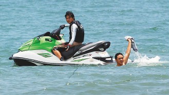 阮經(jīng)天跳下海后,才悄悄脫掉海灘褲。