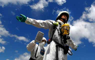 演習(xí)中舉行輻射彈爆炸處置,身著防護(hù)衣的臺軍部隊(duì)進(jìn)行輻射偵測