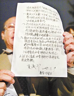 律師展示吳淑珍發(fā)表三點(diǎn)聲明的親筆簽名。