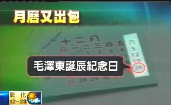 這份2009年的月歷,仔細看,10月1日是大陸的國慶節(jié),這月歷卡又用紅色特別標示,此外,12月這一排星期六都是黑色字體,偏偏26日“紅通通”,一查,這可是毛澤東誕辰紀念日,但這回發(fā)生在臺涉外部門東部辦事處。