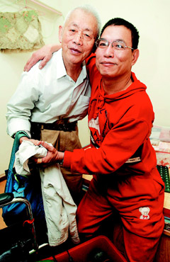 提著藍(lán)色布包,87歲的胡偉昨天早上搭著公交車來到中山女高校門口,加入善愿愛心協(xié)會志工的行列,這是他七年多來每周日例行活動,風(fēng)雨無阻。他是協(xié)會“國寶級”志工,因年歲大行動較為緩慢,昨天他一如往常與其它志工前往受助人家中,駝著背將捐出的1000元善款交到小他26歲的身障者蔡行展手里。